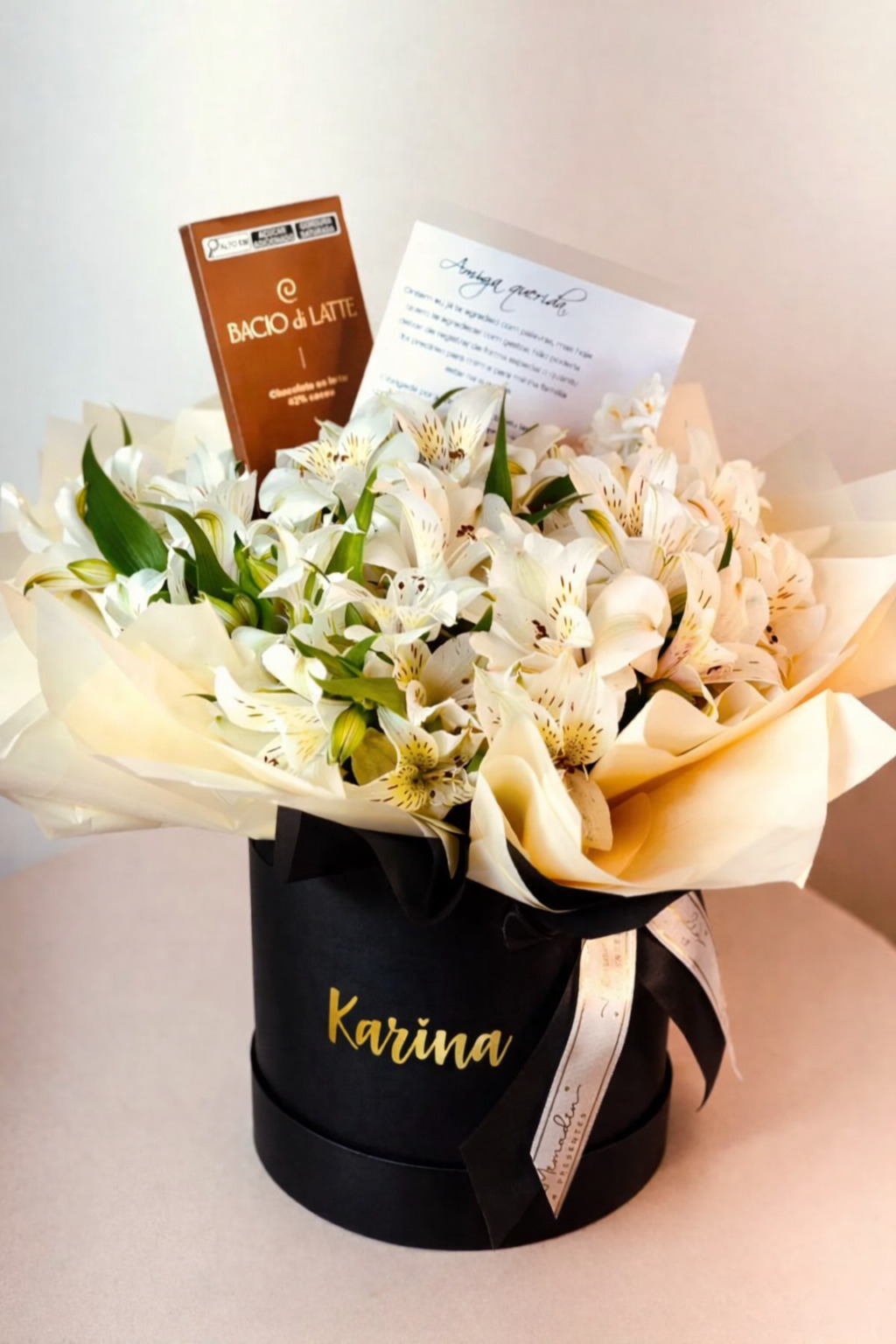 Box de Flores Astrómelias Brancas e Chocolate