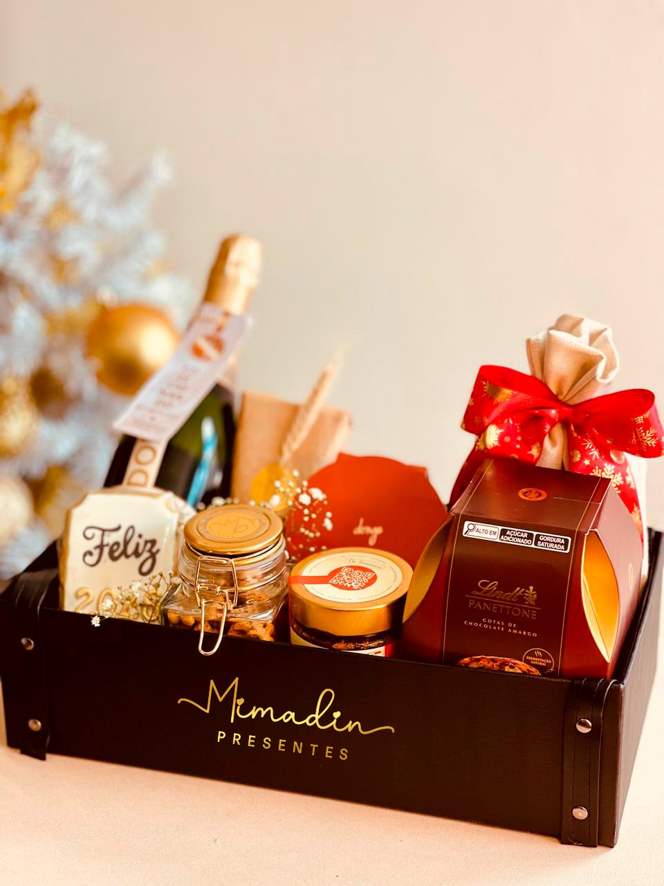 Caixa cartonada preta com alça de couro personalizada com o nome