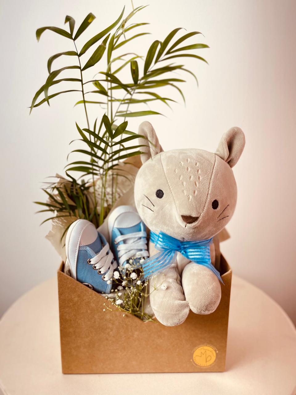 Nosso kit combina o carinho de um ursinho de pelúcia, os primeiros passinhos representados por um delicado tênis e a vida que floresce em uma planta natural. Um gesto de amor que simboliza cuidado, proteção e crescimento — perfeito para marcar este momento tão especial com ternura e afeto.
